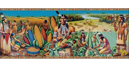 The mural, titled “Corn,” highlights Indigenous people, their culture, and industry. It measures 8 feet by 20 feet and is made up of five printed metal panels.