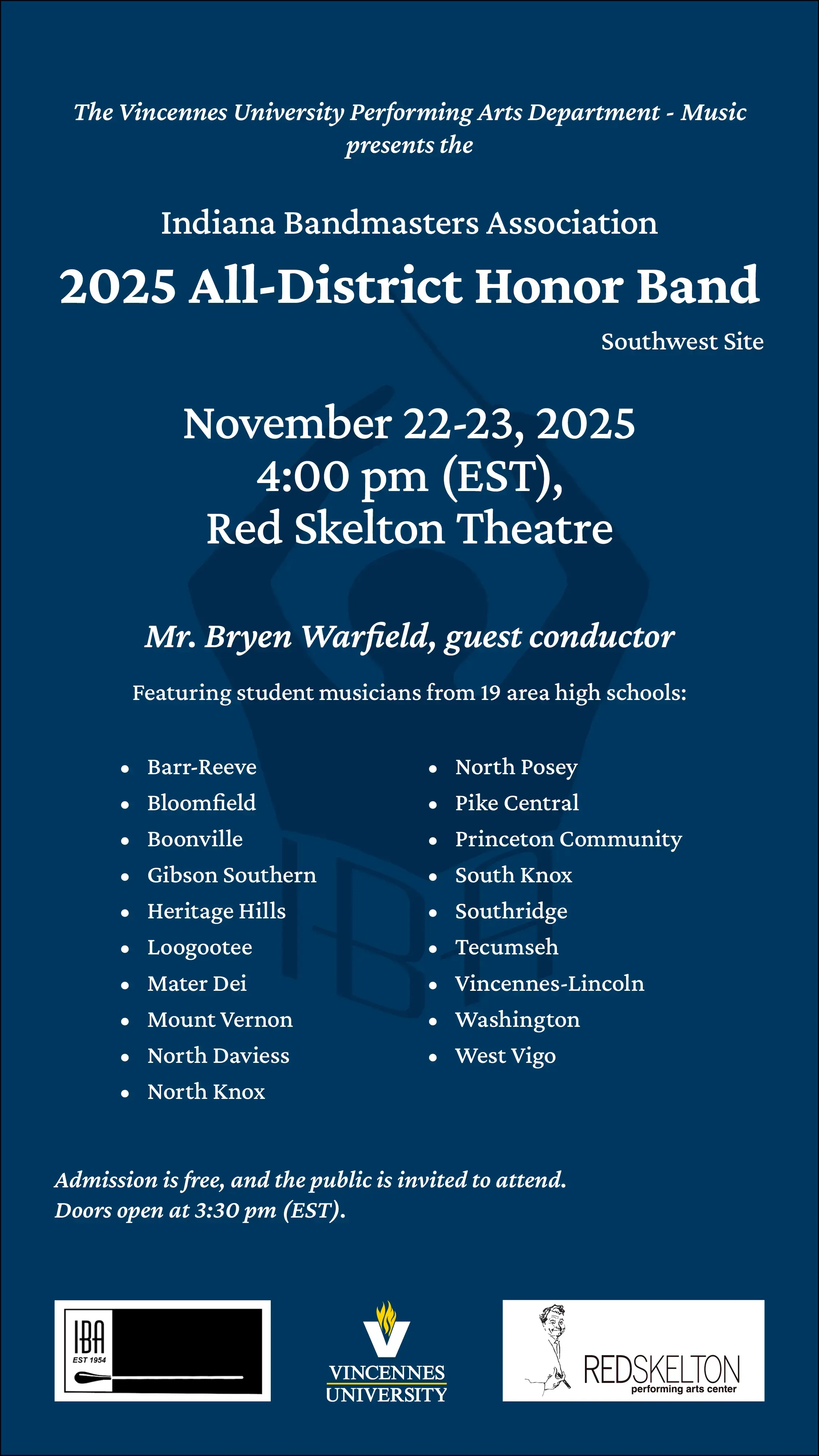 The Vincennes University Performing Arts Department will host the southwest site of the Indiana Bandmasters Association 2025 All-District Honor Band on Saturday, November 22nd, and Sunday, November 23rd, at the Red Skelton Performing Arts Center. Vincennes University